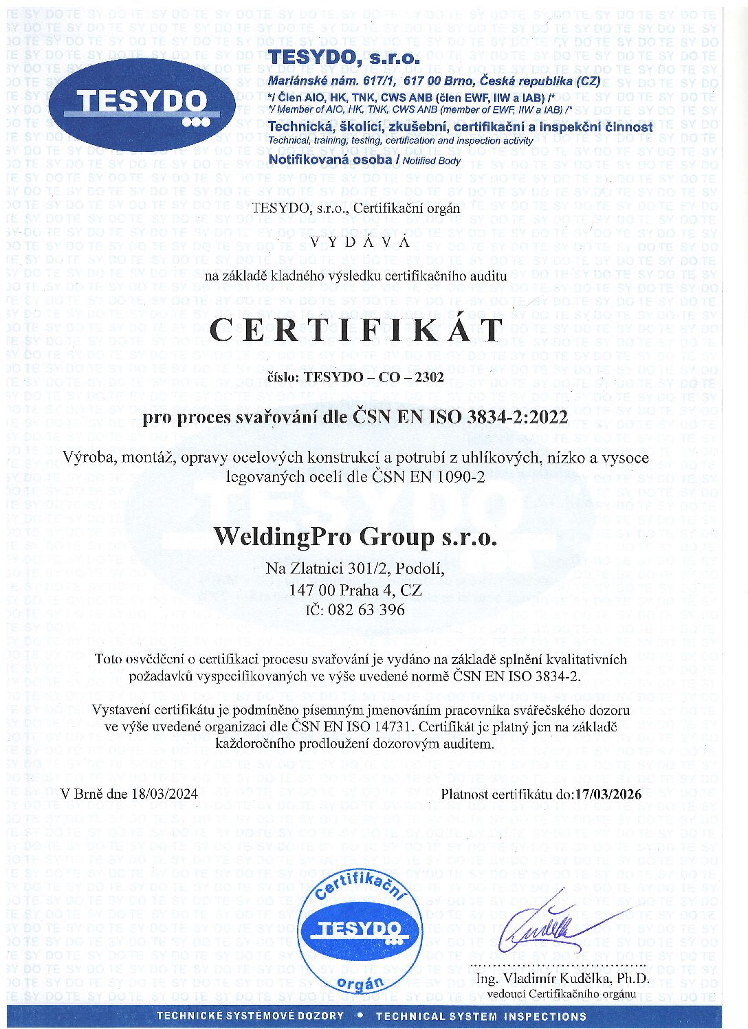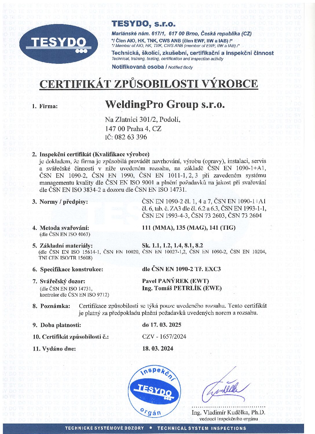 Certifikát způsobilosti výrobce ČSN EN ISO 3834-2