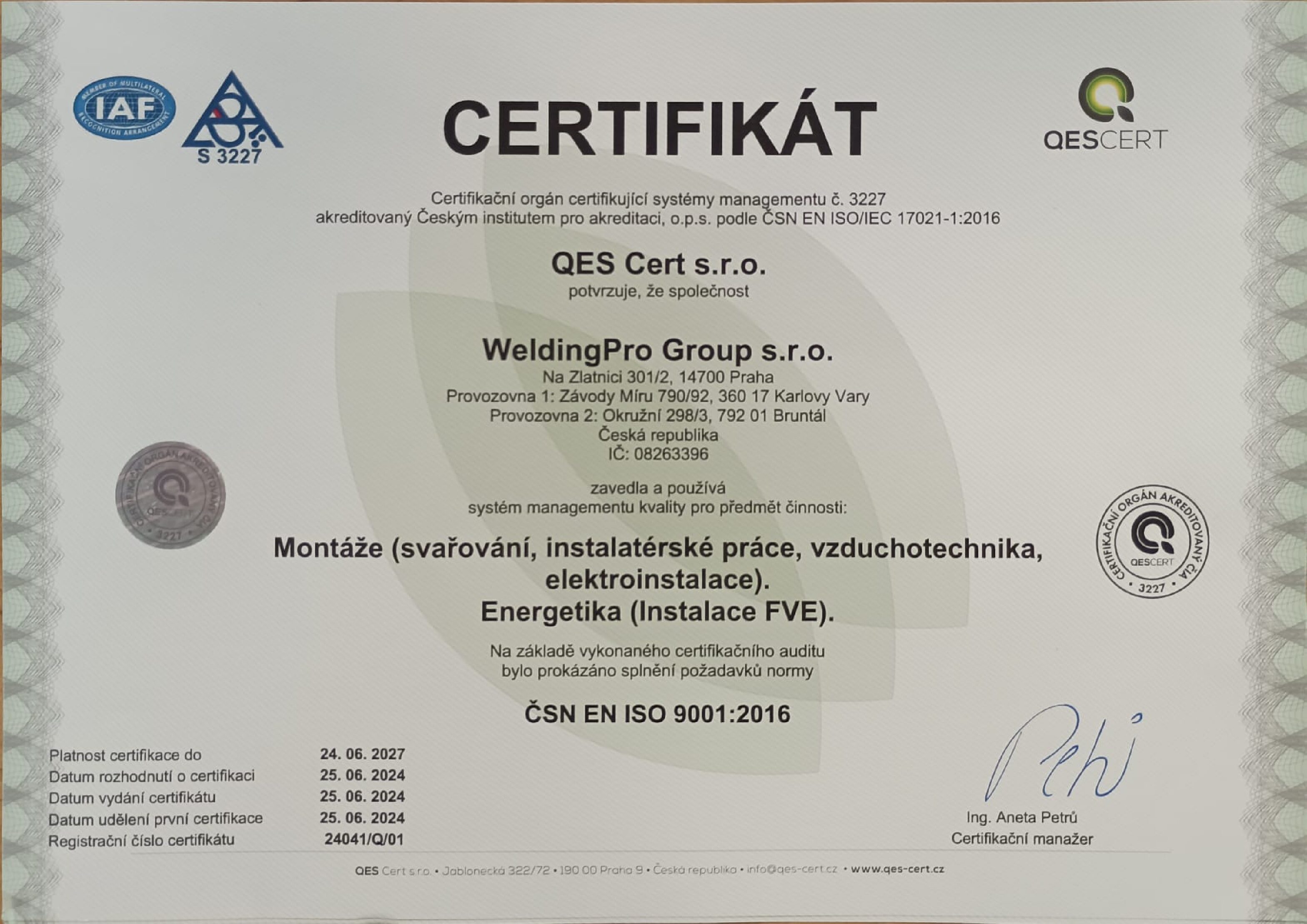 ČSN EN ISO 9001 2016 Certifikát CZ