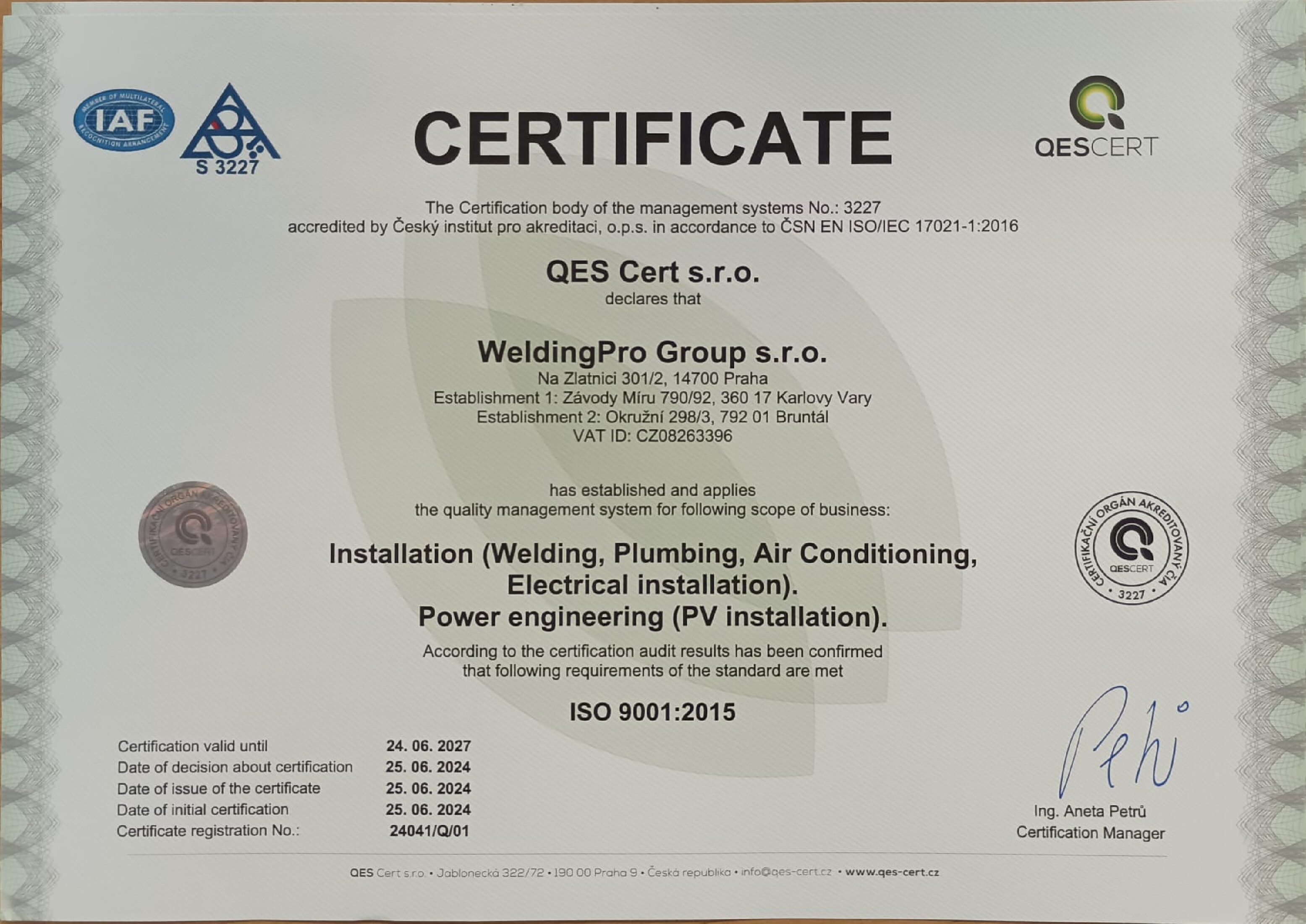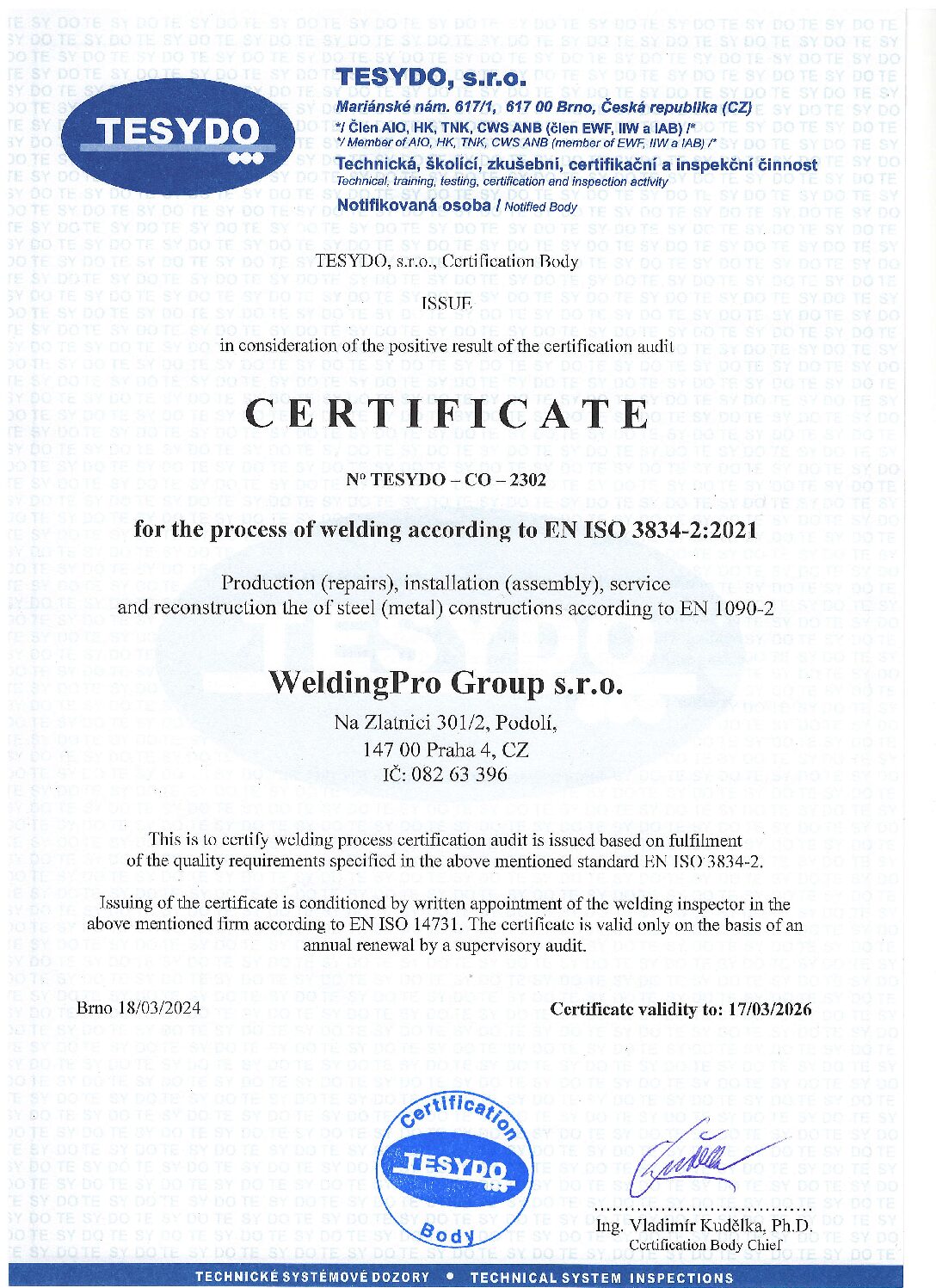 Certificate of the process of welding ČSN EN ISO 3834-2